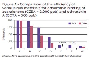 Salah satu trial dengan menggunakan mycotoxin Zearolonone dan Ochratoxin A. dapat kita lihat hasil trial dari Tabel 1 yang menunjukkan variasi yang signifikan pada setiap mycotoxin binder (silicate) dan kombinasi yeast cell wall dalam mengikat atau mengadsorpsi toksin.