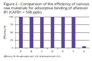 Sedangkan untuk jenis mycotoxin Aflatoxin B1, hampir seluruh mycotoxin binder berhasil mengikat atau mengadsorpsi secara total (Tabel2). Seluruh mycotoxin binder umumnya sangat baik dalam mengikat Aflatoxin B1, namun kemampuan untuk mengikat jenis toksin lainnya seperti Fusarium, Zearolonone, atau Ochratoxin A sangat bervariasi. Hal ini dikarenakan adanya perbedaan beberapa faktor,yaitu : Luas permukaan partikel, ukuran pori-pori partikel, dan jarak lapisan antara silika ternyata memberikan pengaruh dalam pengikatan toksin.