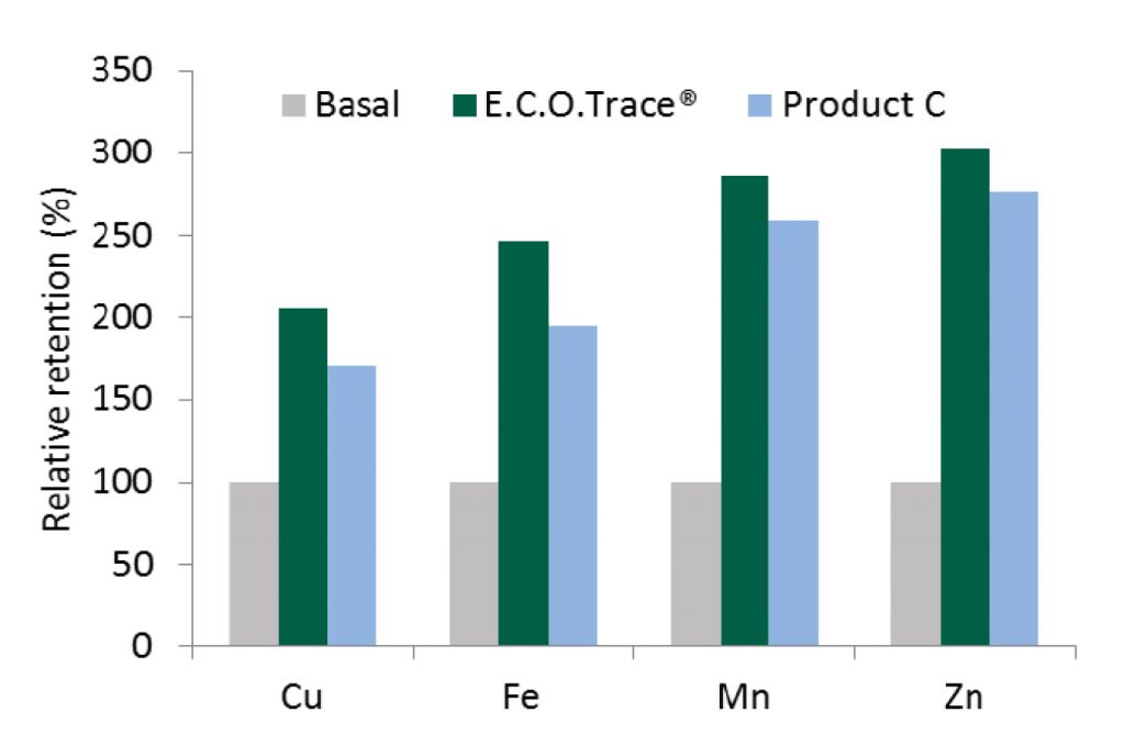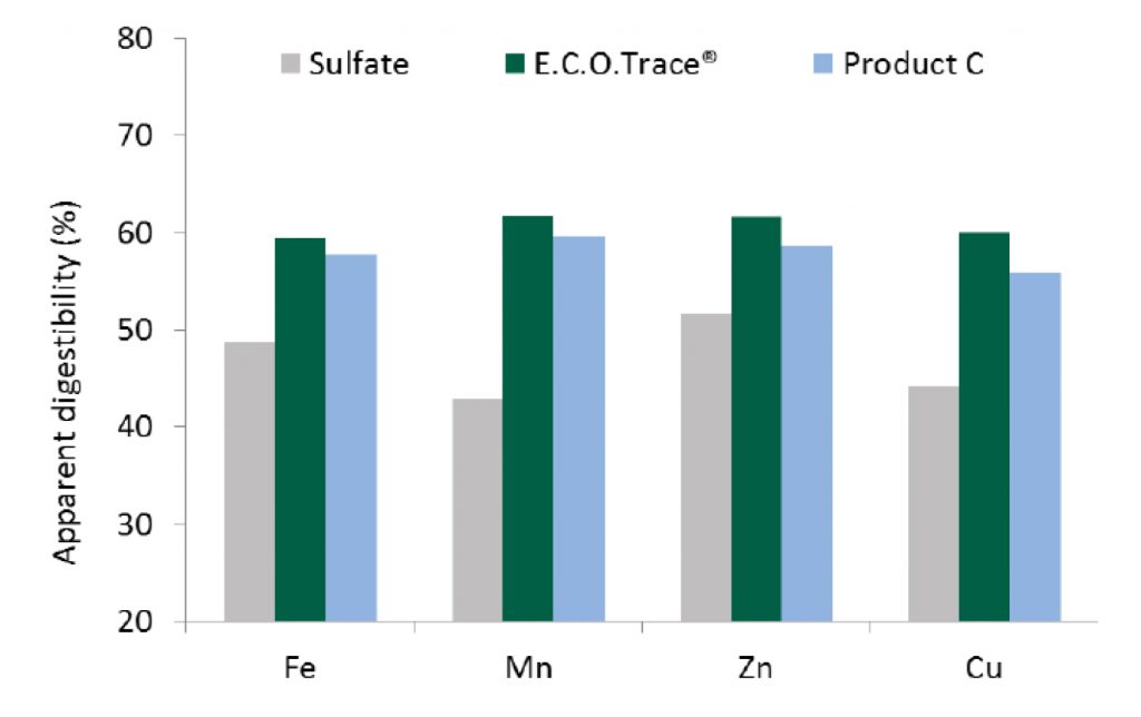 Hasil trial di tahun 2012 (Grafik 1 dan Grafik 2), E.C.O Trace® memberikan hasil lebih tinggi pada bioavailability dan kecernaan metal mineral terhadap produk mineral organik lainnya yang di-chelate glysin. Hal ini membuktikan bahwa proses pengikatan/chelate dengan rasio >1:1 yang tepat memberikan hasil yang lebih optimum pada bioavailability dan digestibility metal mineral tersebut.