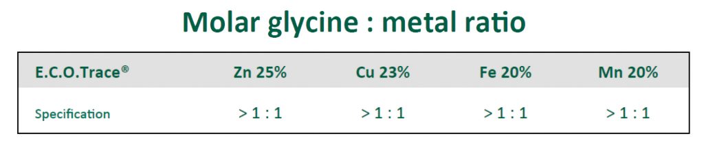 E.C.O Trace® menggunakan kualitas glysin yang terbaik dan rasio ikatan antara glysin dan metal mineral juga merupakan salah satu parameter yang kami perhatikan. Rasio molar glysin dan metal mineral yang baik adalah >1 : 1. Dengan rasio ini akan memberikan bioavailability yang tinggi dan absorbsi lebih sempurna.