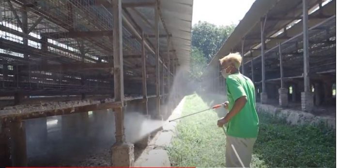 Petugas kandang yang sedang menyemprotkan disinfektan pada kandang