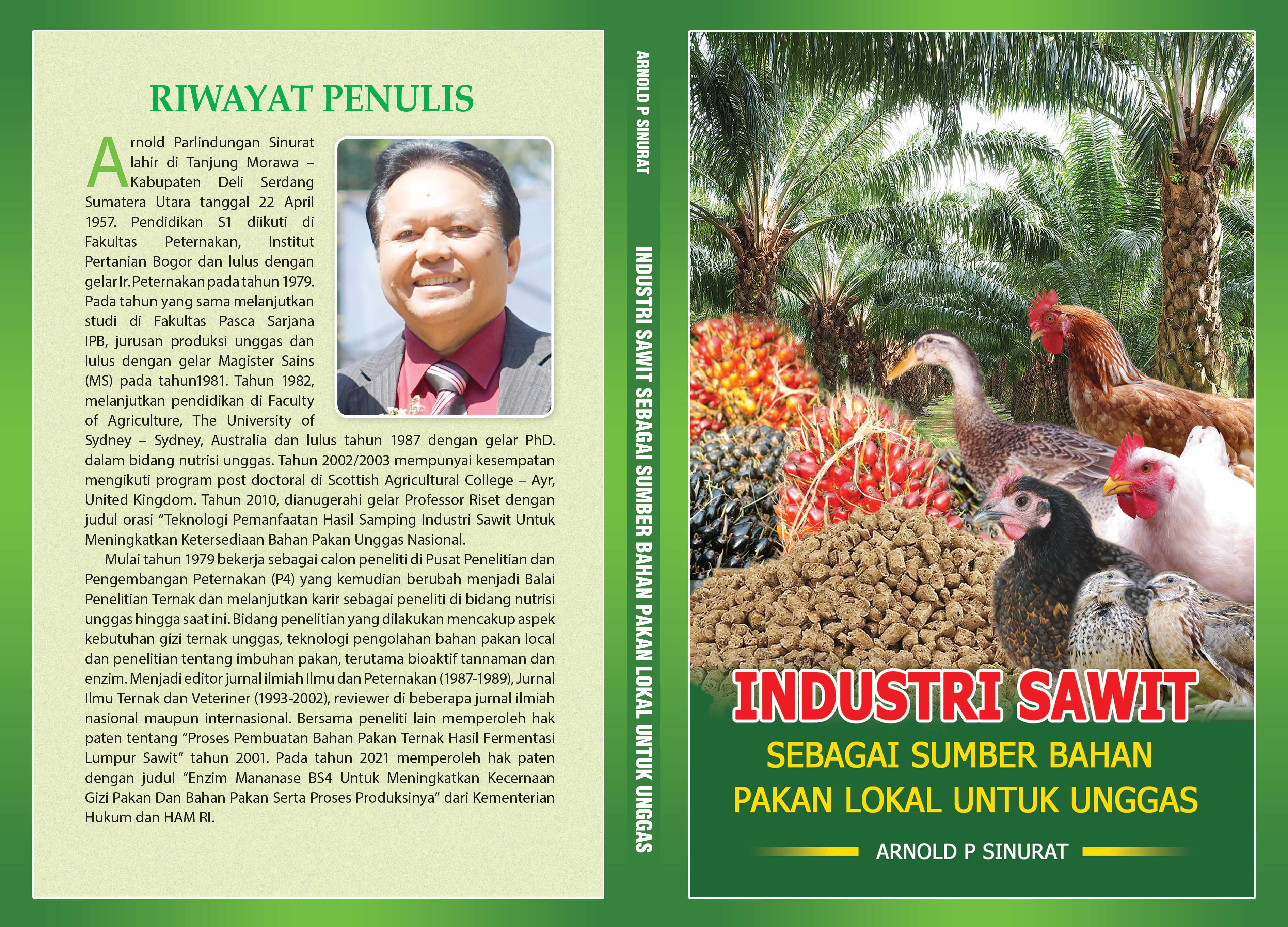 Buku ini menguraikan potensi industri sawit dalam negeri yang menghasilkan produk utama seperti minyak sawit mentah (crude palm oil/ CPO), minyak inti sawit (palm kernel oil/ PKO), inti sawit dan hasil ikutan seperti bungkil inti sawit (palm kernel cake/ PKC) dan solid sawit (palm oil sludge/ POS) dalam jumlah yang banyak dan dapat digunakan sebagai bahan pakan untuk unggas. Uraian disertai dengan kandungan nutrient setiap bahan, hasil uji biologis penggunaan setiap bahan sebagai bahan pakan pada ternak unggas (ayam broiler, ayam ras petelur, ayam lokal, itik dan puyuh).
