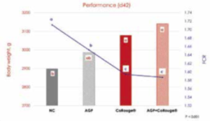 ekor ayam yang dibagi menjadi empat perlakuan: (1) kontrol negatif (NC) tanpa suplementasi, (2) kontrol positif (AGP) dengan penambahan Zinc basitrasin 50ppm, (3) CoRouge® 150 ppm (CR), dan (4) kombinasi Zinc basitrasin (50 ppm) dan CoRouge® (150 ppm) (AGP + CR). Hasil penelitian tersebut menujukkan tidak adanya perbedaan yang signifikan pada feed intake, tetapi terjadi peningkatan yang signifikan pada bobot badan akhir (rerata 3,11 kg) dan peningkatan FCR (rerata 1,59) dibandingkan dengan kontrol negatif sebagaimana terlihat pada Grafik 2.