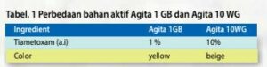 Pada tabel 1, dapat dilihat perbedaan komposisi bahan aktif yang terkandung pada Agita 1GB dan Agita 10 WG, hal ini dipengaruhi oleh cara pengaplikasian yang berbeda, namun keefektifan dan hasil yang didapatkan dalam membasmi lalat tetap sama.