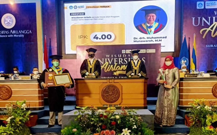 POULTRYINDONESIA, Surabaya – Dr. drh. Muhammad Munawaroh, MM dinobatkan sebagai salah satu wisudawan terbaik pada prosesi Wisuda Periode Maret 2021 Universitas Airlangga yang dilaksanakan secara luring dan daring, Minggu (7/3).