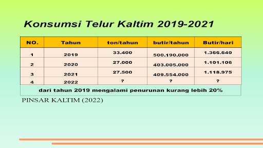 Populasinya ayam ras petelur yang dipelihara di Kalimantan sekitar 1,8 – 2 juta ekor untuk semua umur. Ayam yang berada pada masa produktif bertelur (laying) sekitar 55 persen atau berkisar antara 990.000 – 1.100.000 ekor. Dengan produktivitas per ekor 80 persen, maka sekawanan ayam-ayam tersebut menghasilkan telur 792.000 – 880.000 butir per hari. Jadi kekurangan pasokan sekitar 310.000 – 398.000 butir per hari. Selama ini, defisit telur Kalimantan Timur dipasok dari luar daerah, diantaranya dari Kalimantan Selatan, Jawa dan Sulawesi.  Apabila warga IKN menambah 1,6 juta populasi penduduk, maka kekurangan pasokan telur di Kalimantan Timur akan lebih banyak lagi. Maka solusinya adalah bagimana mendorong peningkatan produksi telur di Kalimantan Timur. *Praktisi Agrobisnis Perunggasan dari Singkawang, Kalimantan Barat