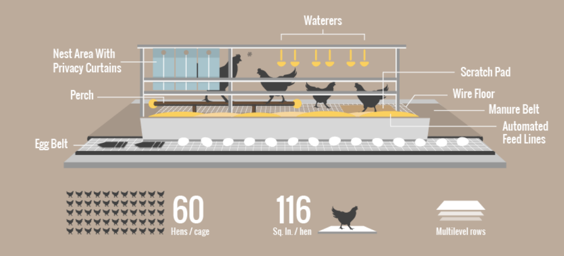 Setiap kandang koloni, berisi 20-60 ayam, termasuk area sarang, tempat bertengger, dan alas gores. Fasilitas ini memungkinkan ayam petelur dapat mengekspresikan perilaku alami utamanya yaitu bersarang, bertengger dan mencakar. Kandang koloni memiliki 1) area bersarang yang tertutup, tempat ayam bertelur, 2) area bertengger juga tersedia untuk semua ayam, 3) Bantalan untuk menggaruk dan mematuk 4) makanan dan air selalu tersedia, 5) Adanya sabuk bergerak yang terus menerus menangkap dan membuang kotoran untuk menjaga kebersihan dan kesejahteraan ayam di kandang. Kandang koloni juga bisa dibangun bertingkat seperti kandang baterai, sehingga bisa cukup menghemat ruangan dan mengizinkan efisiensi ekonomi.