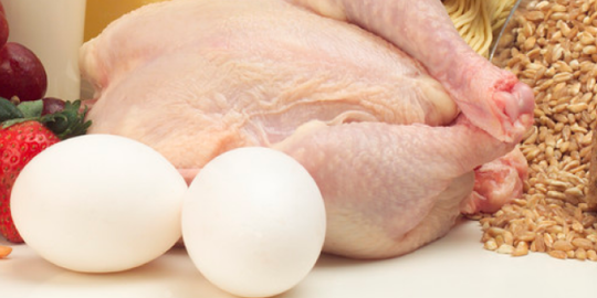 Daging dan telur ayam merupakan sumber protein hewani yang relatif terjangkau