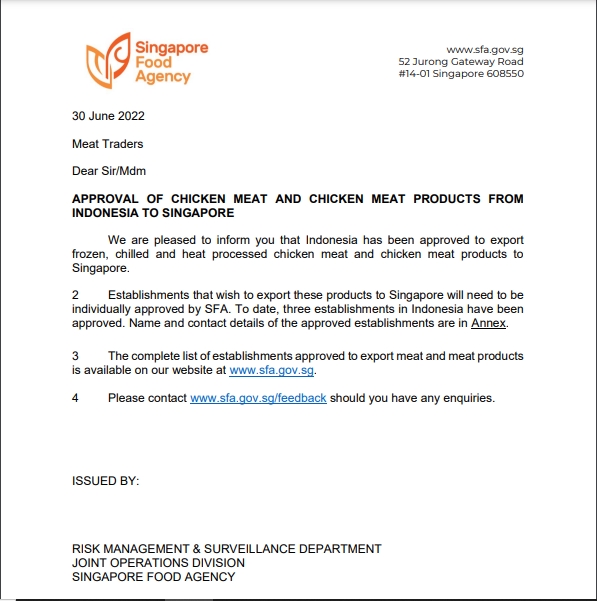Isi dalam surat tersebut kurang lebih memberikan izin impor Singapura untuk daging unggas, beserta kriteria daging unggas yang diizinkan untuk diimpor. “Kami menginformasikan bahwa Indonesia telah diizinkan untuk mengekspor daging unggas beku, dingin, dan daging yang telah melalui proses pemanasan”.