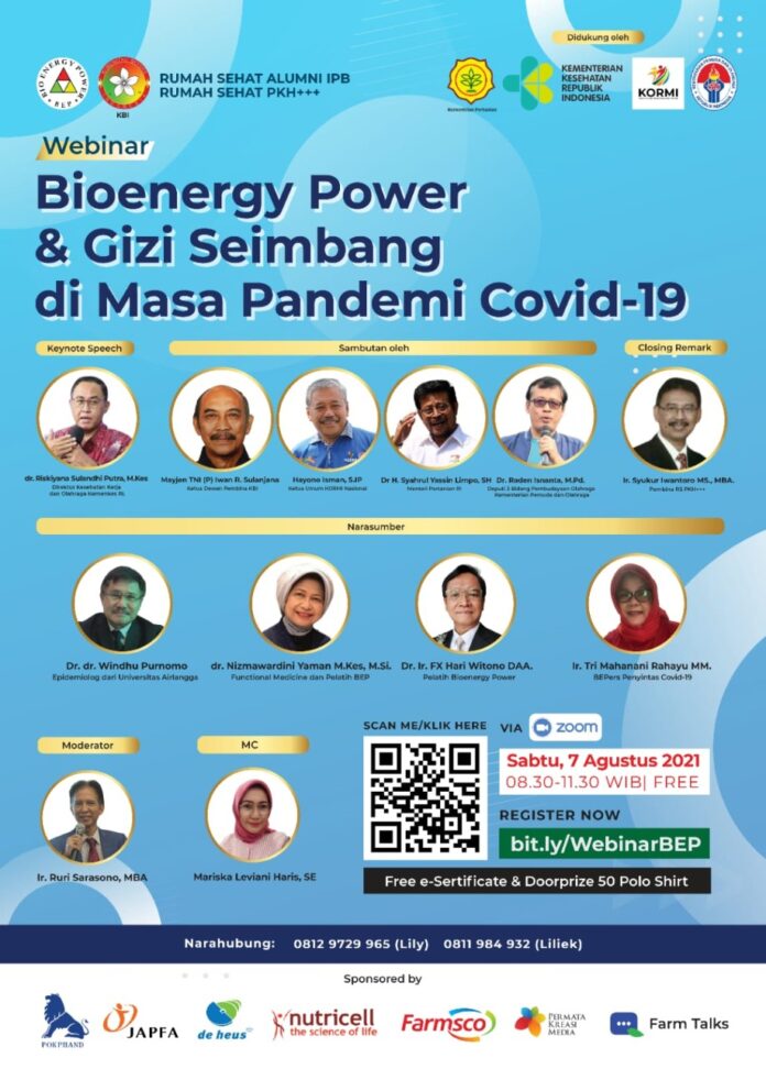 POULTRYINDONESIA, Jakarta – Rumah Sehat Bioenergy Power (BEP) Alumni IPB dan Rumah Sehat BEP PKH (Peternakan dan Kesehatan Hewan) Kementerian Pertanian mengadakan Webinar bertajuk Bioenergy Power dan Gizi Seimbang di Masa Pandemi Covid-19. Webinar yang upaya menjadi upaya pengabdian kepada masyarakat tersebut akan diselenggarakan via Zoom, Sabtu (7/8).