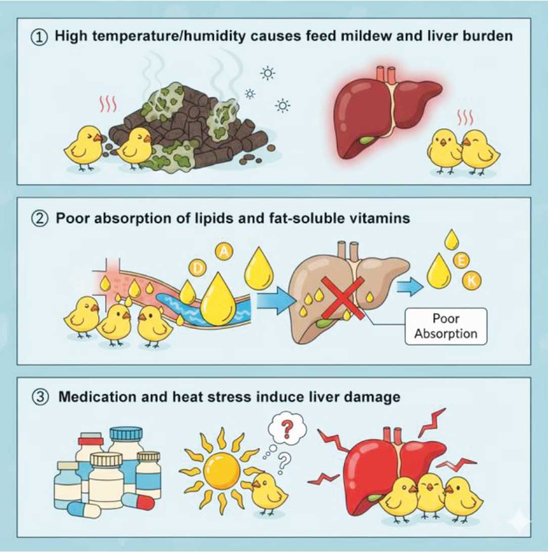 High temperature and humidity, which promote feed mold growth and increase liver workload;