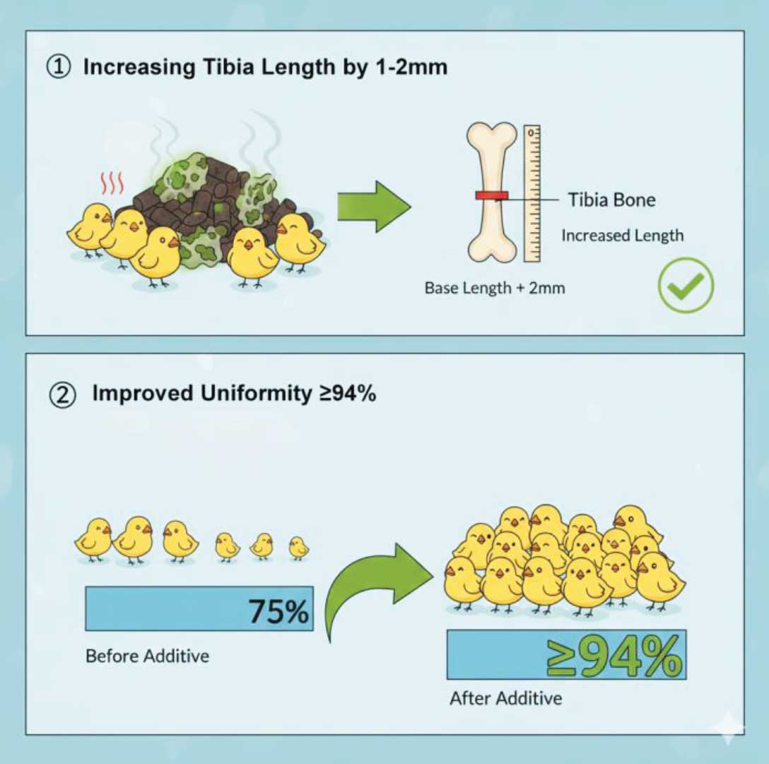 (1) Enhancing Absorption, Securing Two Key Targets RUNEON helps emulsify fats (fat utilization increases by ≥20%), improves calcium and phosphorus absorption, resulting in an increase in tibia length by approximately 1–2 mm. Body weight before the onset of lay increases by 5–10%, with flock uniformity reaching ≥94%.