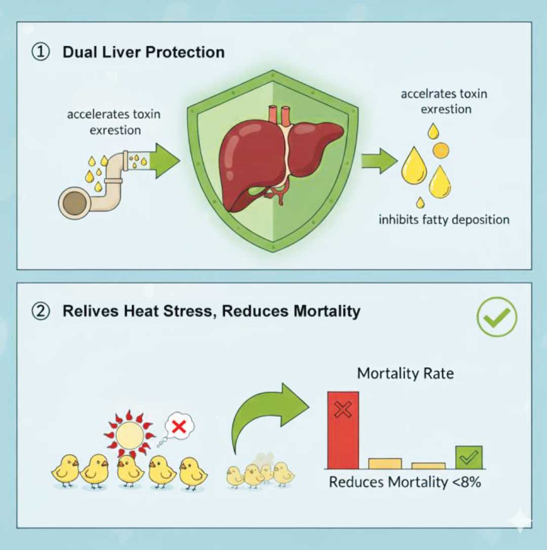 (2) Liver Protection, Heat Stress Reduction Provides dual liver protection by accelerating toxin excretion and inhibiting fat accumulation. Helps alleviate heat stress and reduces mortality rates.