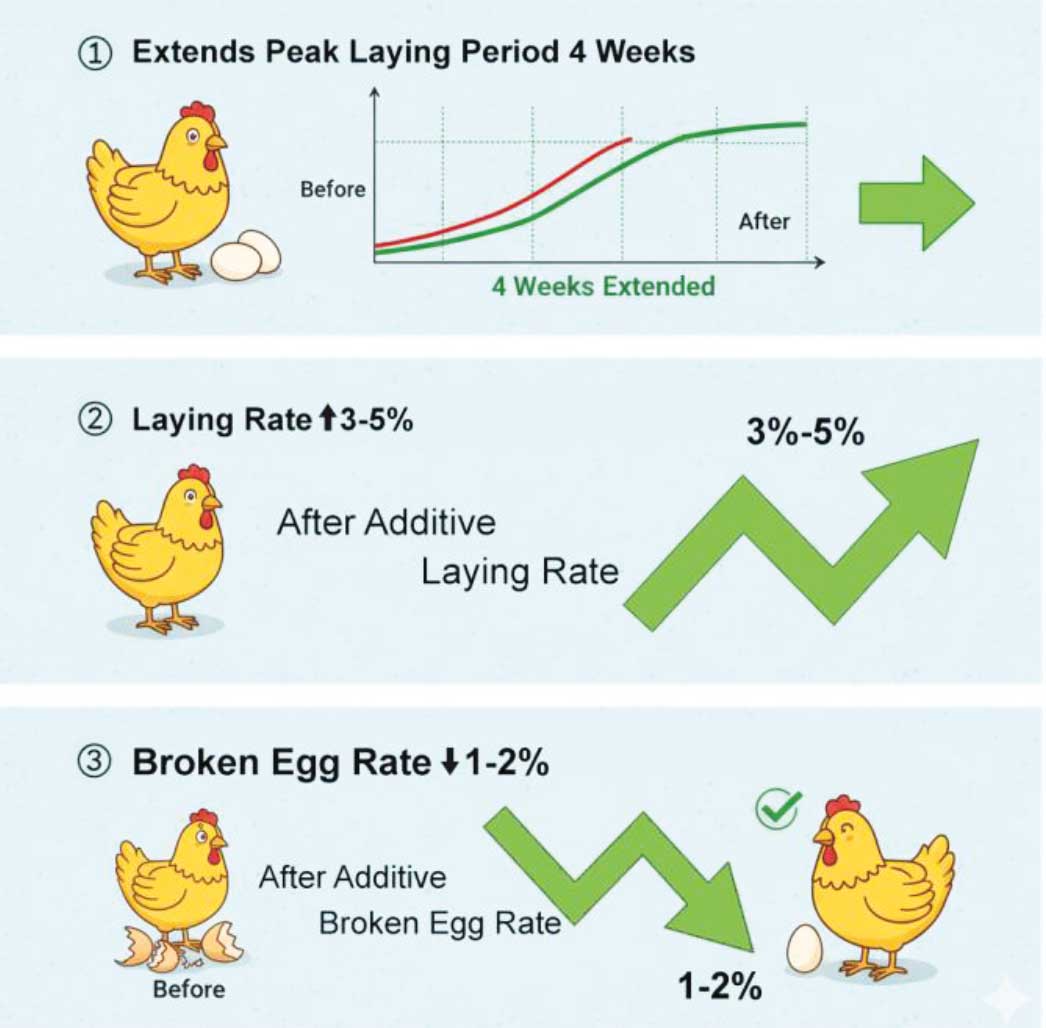 (3) Improving Egg Production Performance Extends the peak egg production period by up to 4 weeks, increases egg production by 3–5%, and reduces cracked egg rates by 1–2%.