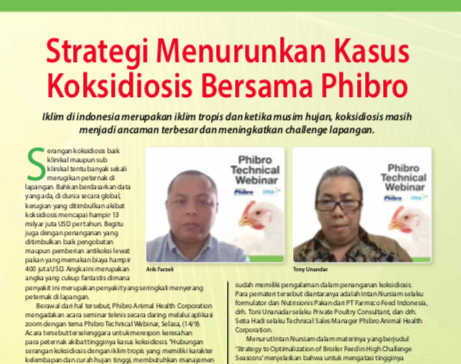 Berawal dari hal tersebut, Phibro Animal Health Corporation mengadakan acara seminar teknis secara daring melalui aplikasi zoom dengan tema Phibro Technical Webinar, Selasa, (14/9). Acara tersebut terselenggara untuk merespon keresahan para peternak akibat tingginya kasus koksidiosis. “Hubungan serangan koksidiosis dengan iklim tropis yang memiliki karakter kelembapan dan curah hujan tinggi, membutuhkan manajemen pemeliharaan yang tepat didukung dengan asupan pakan yang spesifik dibahas secara tuntas dalam webinar ini,” ungkap Arik Fazeli, DVM selaku Country Director Phibro Animal Health Indonesia.