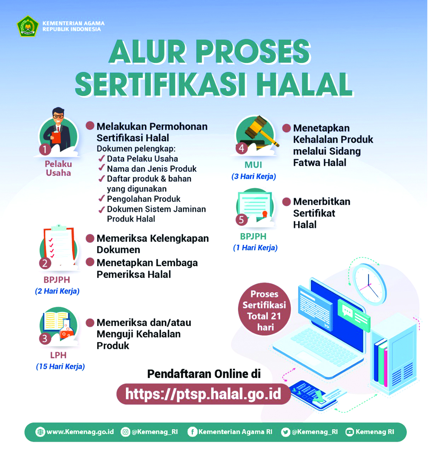 Kemudian dalam prosedur pelaksanaan RPA halal pelaku usaha harus mengajukan permohonan sertifikasi halal kepada BPJPH melalui laman https://ptsp.halal.go.id. Selanjutnya BPJPH akan melakukan pemeriksaan dokumen permohonan dan menetapkan Lembaga Pemeriksa Halal (LPH) berdasarkan pilihan pemohon. Setelah itu, LPH melakukan pemeriksaan dan/atau pengujian kehalalan produk yang hasilnya disampaikan kepada BPJPH.