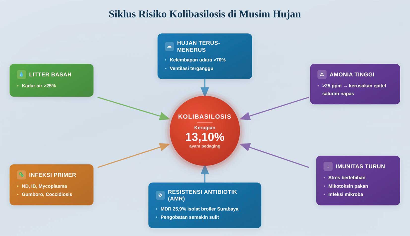This story is nothing new. In fact, because it occurs so frequently, colibacillosis is often regarded as an “ordinary” disease in the Indonesian poultry industry. However, research by Wibisono et al. (2018) shows that economic losses due to colibacillosis reach 13.10% of total national poultry assets—a highly significant figure.