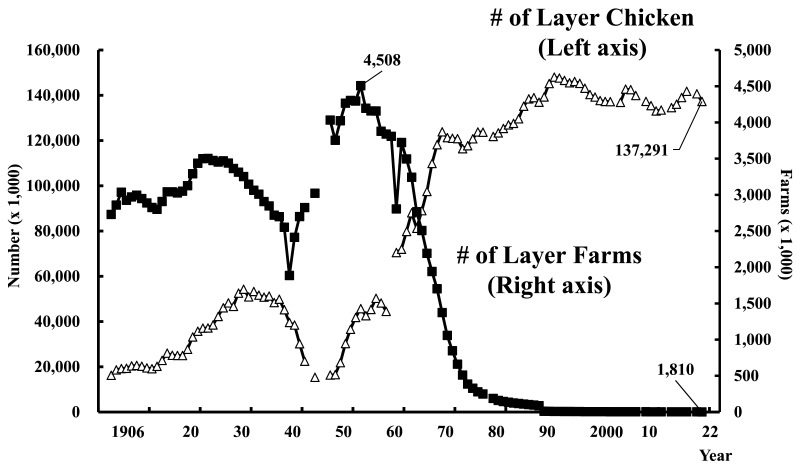 Seperti yang ditunjukkan pada Grafik 1, jumlah peternakan ayam petelur di Jepang meningkat tajam setelah PD II hingga mencapai puncaknya pada tahun 1955 (sekitar 4,5 juta peternakan) dan menurun dengan cepat setelahnya. Jumlah populasi ayam petelur pada awalnya meningkat secara paralel dengan peningkatan jumlah peternakan ayam petelur. Hal ini terus meningkat hingga awal tahun 1990, dan kemudian mengalami penurunan. Menurut data Ministry of Agriculture, Forestry and Fisheries Japan (MAFF), terdapat 1.810 peternakan ayam petelur dengan total populasi sekitar 137 juta ekor ayam petelur telah dipelihara di Jepang pada tahun 2022.
