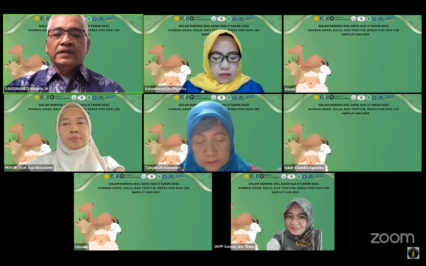 Berdasarkan hal tersebut dalam rangka Idul Adha 1444 H, Asosiasi Kesehatan Masyarakat Veteriner Indonesia (Askesmaveti) berkolaborasi dengan Fakultas Kedokteran Hewan Universitas Brawijaya (FKH UB) serta Sekolah Kedokteran Hewan dan Biomedis Intitut Pertanian Bogor (SKHB IPB), The Halal Science Center (HSC) of IPB University, Direktorat Kesehatan Masyarakat Veteriner, Direktorat Jenderal Peternakan dan Kesehatan Hewan (Ditjen PKH) Kementerian Pertanian (Kementan), Perhimpunan Dokter Hewan Indonesia (PDHI), dan Majelis Ulama Indonesia (MUI) menyelenggarakan Webinar Kurban Seri II dengan mengusung tema “Peningkatan Pengetahuan dan Keterampilan Pengurus DKM Se-Indonesia dalam Penyelenggaraan Idul Adha 1444 H” secara daring, Sabtu (17/6).