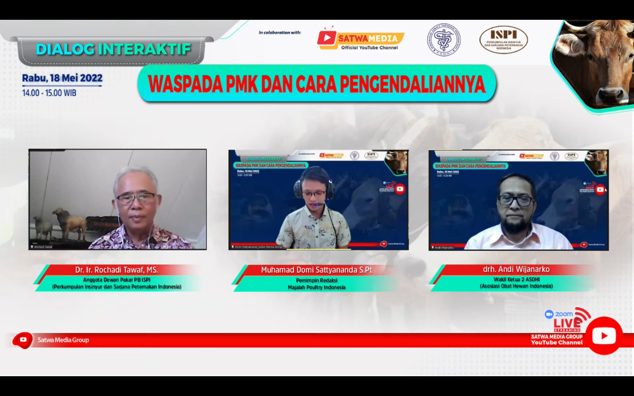 SATWAMEDIA, Jakarta – Setelah dinyatakan bebas penyakit mulut dan kuku (PMK) pada tahun 1990, Indonesia harus kembali menerima kenyataan pahit di pertengahan tahun ini. Pasalnya pada bulan Mei 2022, kasus PMK kembali dilaporkan terjadi di Jawa Timur dan Aceh. Merespon hal tersebut, Satwa media group sebagai media yang menaungi majalah Poultry Indonesia, dan Aqua Indonesia menggelar diskusi interaktif secara daring melalui Kanal YouTube Satwa Media Group, Rabu (18/5). Dalam pelaksanaannya, Satwa Media Group bekerja sama dengan Pengurus Besar Perkumpulan Insinyur dan Sarjana Peternakan Indonesia (PB ISPI) dan Asosiasi Obat Hewan Indonesia (ASOHI).